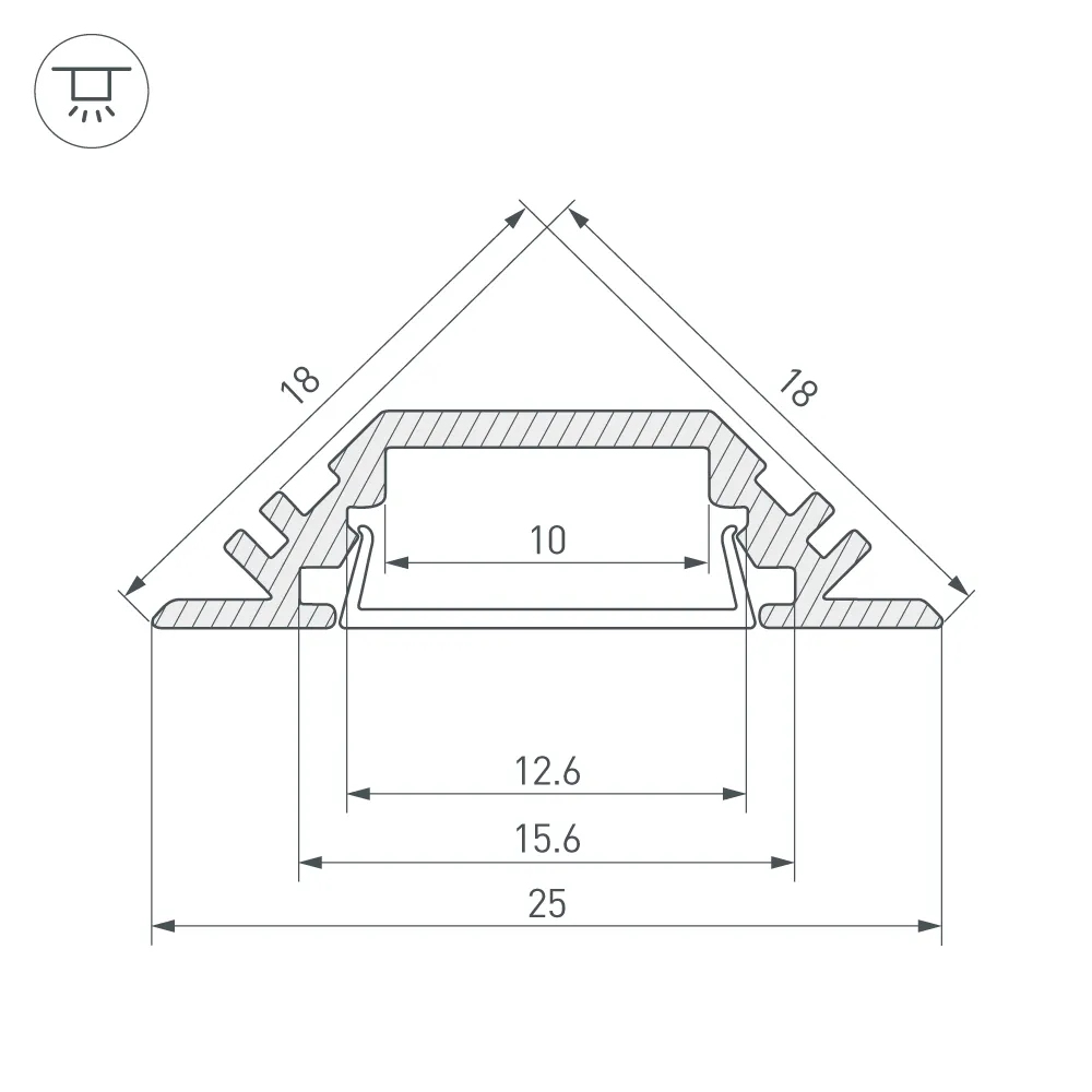 Угловой алюминиевый профиль, 45 градусов. Анодированный. Для светодиодных лент шириной до 10мм. Размеры ширина 25мм, при установке в угол 18х18мм.
