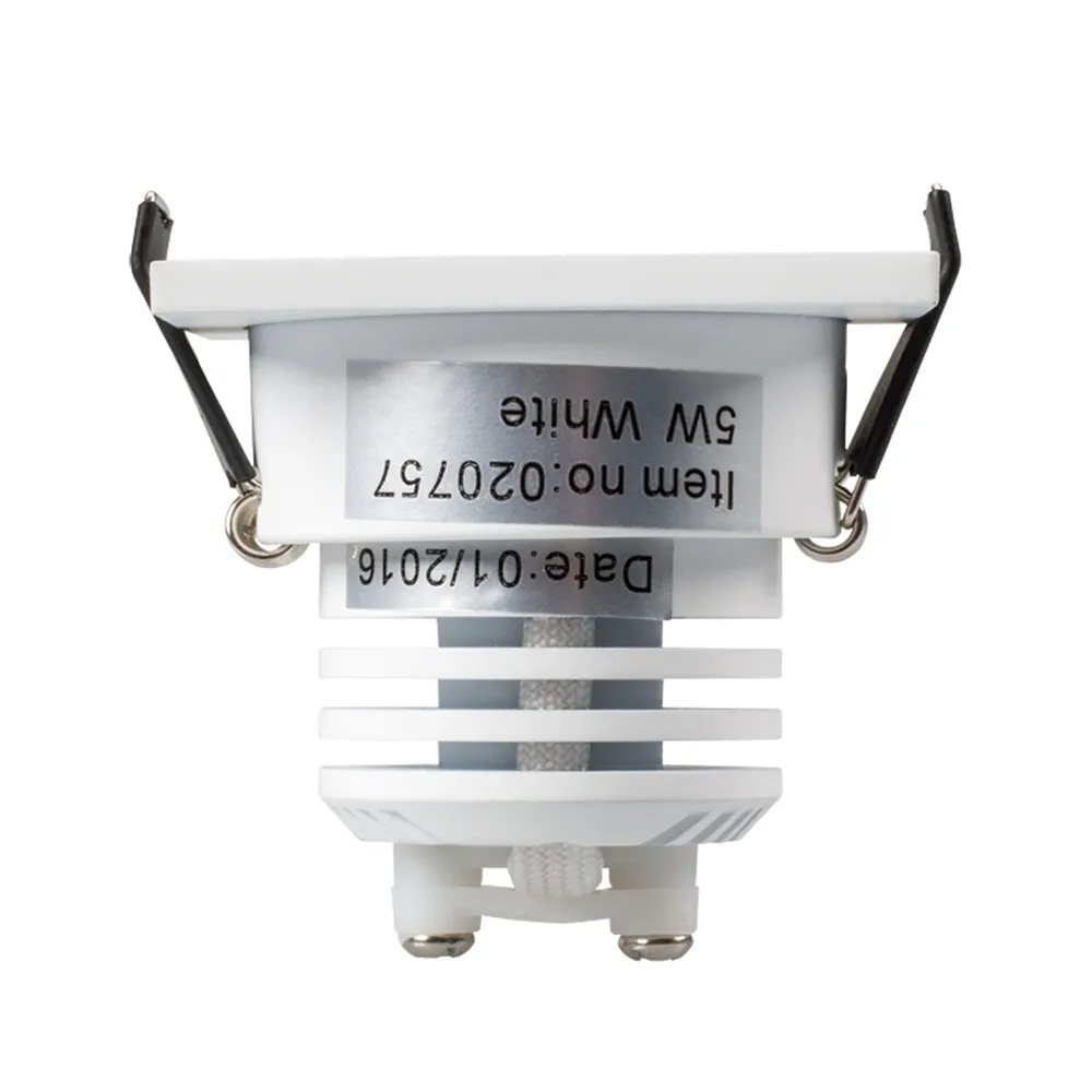 Врезной квадратный мебельный светильник 5Вт, корпус белый алюминий. Цвет ТЕПЛЫЙ БЕЛЫЙ 3000K. Светодиод 1х5W Bridgelux. CRI>80, Св.поток 350-400лм, наклоняемая ось, угол 25°. Питание 180-240VAC, 5Вт, 400mA 11-13V, драйвер в комплекте. Размеры 50x50x50 мм, врезное отверстие d42 мм.