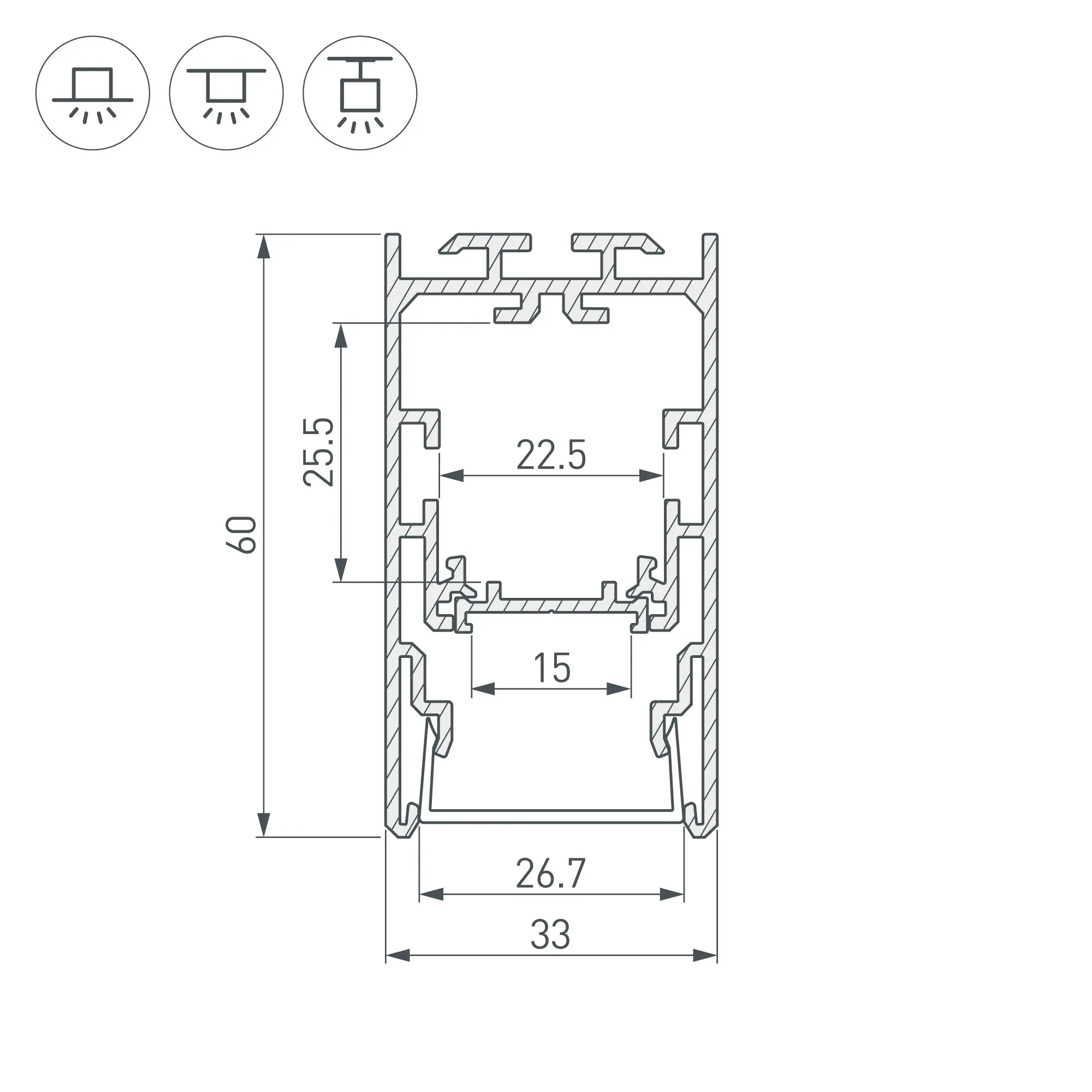 Комплект с экраном. Алюминиевый анодированный профиль для светодиодных лент и линеек. Габаритные размеры (L×W×H): 2500x33x60 мм. В комплекте профиль, основание для ленты, PC матовый экран, фиксаторы основания 4 шт, винты 3 шт. Отсек для БП 21х24мм (±1 мм). Ширина площадки для ленты 15 мм. Светопропускание экрана 85%. Аксессуары приобретаются отдельно.