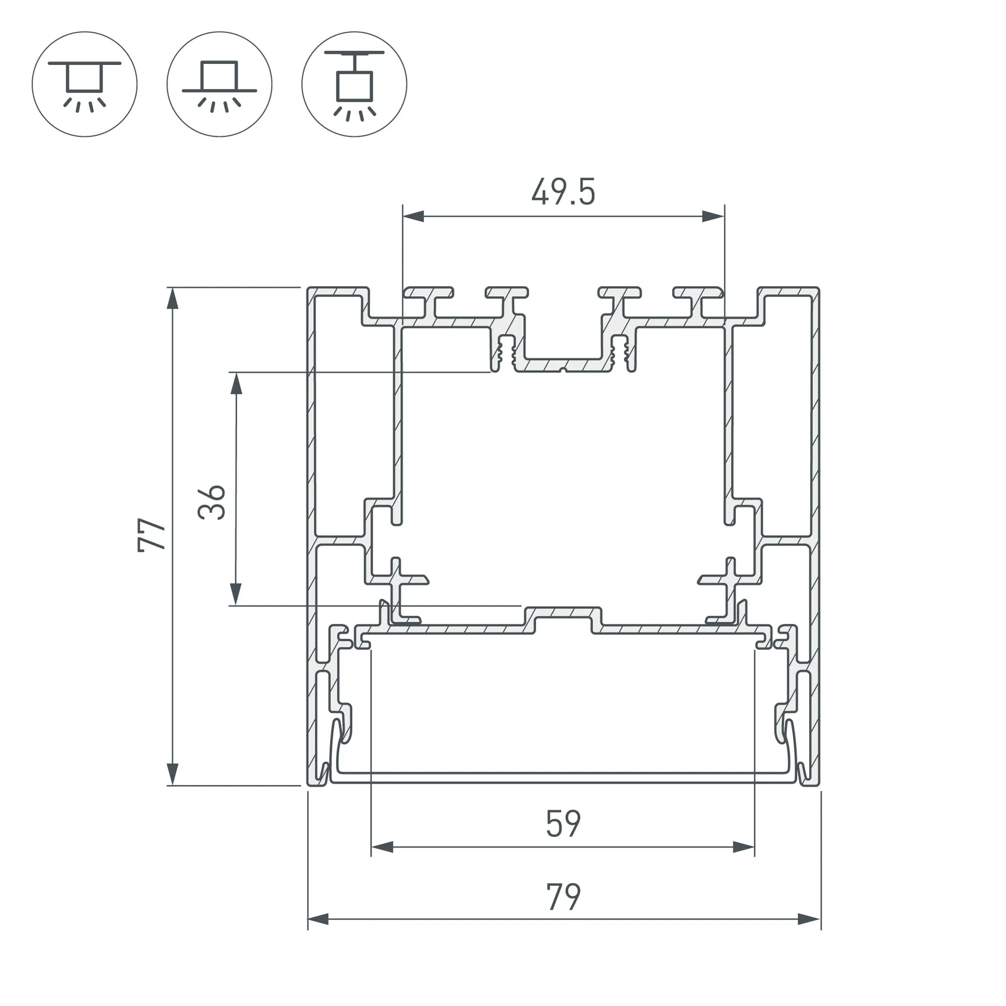 Комплект с экраном. Алюминиевый анодированный профиль для светодиодных лент и линеек. Габаритные размеры (L×W×H): 2500x79x77 мм. В комплекте профиль, основание для ленты, PC матовый экран, фиксаторы основания 4шт, винты. Отсек для БП 50х32мм (±1 мм). Ширина площадки для ленты 59 мм. Светопропускание экрана 85%. Аксессуары приобретаются отдельно. Цена за комплект.