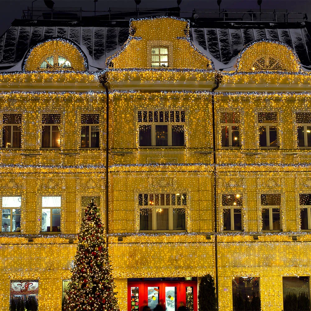 Светодиодный Занавес Classic. Размер 2000x9000 мм (длина 2000 мм, высота 9000 мм). 20 ниспадающих нитей длиной 9000 мм. 2200 светодиодов размером 7 мм. Цвет свечения ТЕПЛЫЙ БЕЛЫЙ (3000 К), постоянное свечение и 8 динамических эффектов с резким световым рисунком (прозрачная вогнутая линза). Провод прозрачный, ПВХ. Питание 230 В, Мощность 120 Вт, защита IP65, применение в помещении и на улице под навесом. Аксессуар для подключения и выбора режима свечения в комплекте.