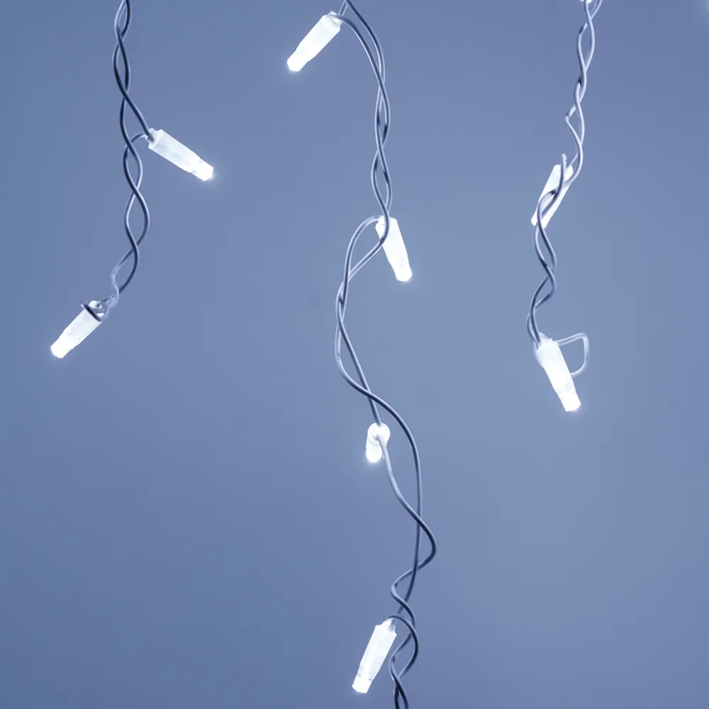 Светодиодная бахрома Pro. Размер 5600x900 мм (длина 5600 мм, по длине 48 нитей высотой 200/900 мм). Количество светодиодов 240 шт размером 7 мм. Цвет свечения БЕЛЫЙ (6000 К), эффект постоянного свечения с резким световым рисунком (прозрачная вогнутая линза). Провод белый, резиновый. Питание 230 В, Мощность 15 Вт, защита IP65, применение на улице под навесом. Аксессуары для подключения приобретаются отдельно.