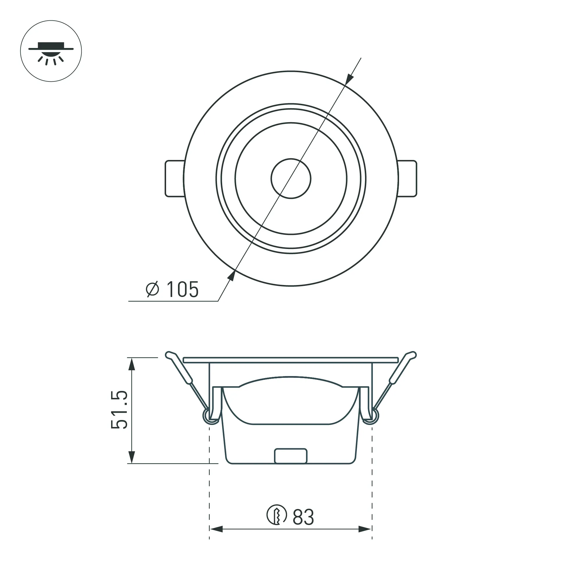 Встраиваемый поворотный светильник "даунлайт". Мощность 10 Вт, св. поток 900 лм, 90 лм/Вт, дневной 4000 K, CRI>80, UGR<19, угол 36°, напряжение питания 230 В. Белый круглый корпус из теплопроводящего полиамида, степень защиты IP20, угол поворота оси 30°. Размер: диаметр 105 мм, высота 51.5 мм. Монтаж встраиваемый, установочное отверстие диаметр 83-95 мм. Пульсация <2%.