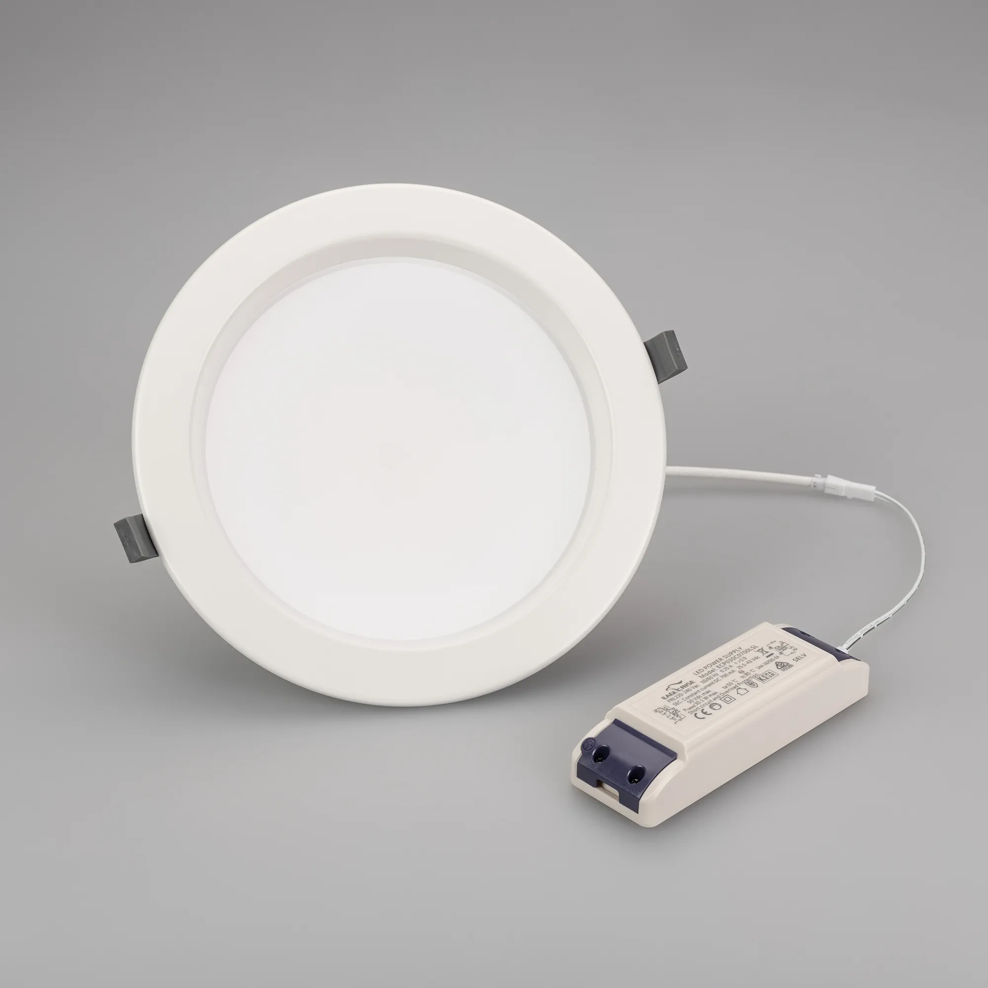 Встраиваемый светильник "Даунлайт" 30Вт. Цвет свечения БЕЛЫЙ 6000К, или ДНЕВНОЙ 4000К, или ТЕПЛЫЙ 3000К, выбор цвета свечения при установке, фиксированный. Световой поток 2610-2820лм, угол 90°, CRI>80. Белый корпус. Питание AC220-240V. Габариты: Ø230х75мм, врезное отверстие Ø192-210мм. Драйвер в комплекте (25-43, 700mA).