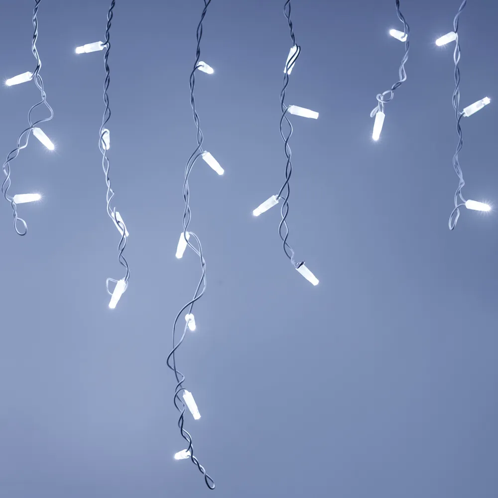 Светодиодная бахрома Pro. Размер 5600 мм (длина 5600 мм, по длине 48 нитей высотой 200/900 мм). Количество светодиодов 240 шт размером 7 мм. Основной цвет свечения БЕЛЫЙ (6000 К), эффект мерцания редких точек БЕЛЫЙ (6000К) с мягким световым рисунком (выпуклая молочно-белая линза), соотношение светодиодов: 198 белых постоянного свечения / 42 белых с мерцанием. Эффект частого мерцания. Провод белый, каучук. Питание 230 В, Мощность 6 Вт, защита IP65, применение на улице под навесом. Аксессуары для подключения приобретаются отдельно.
