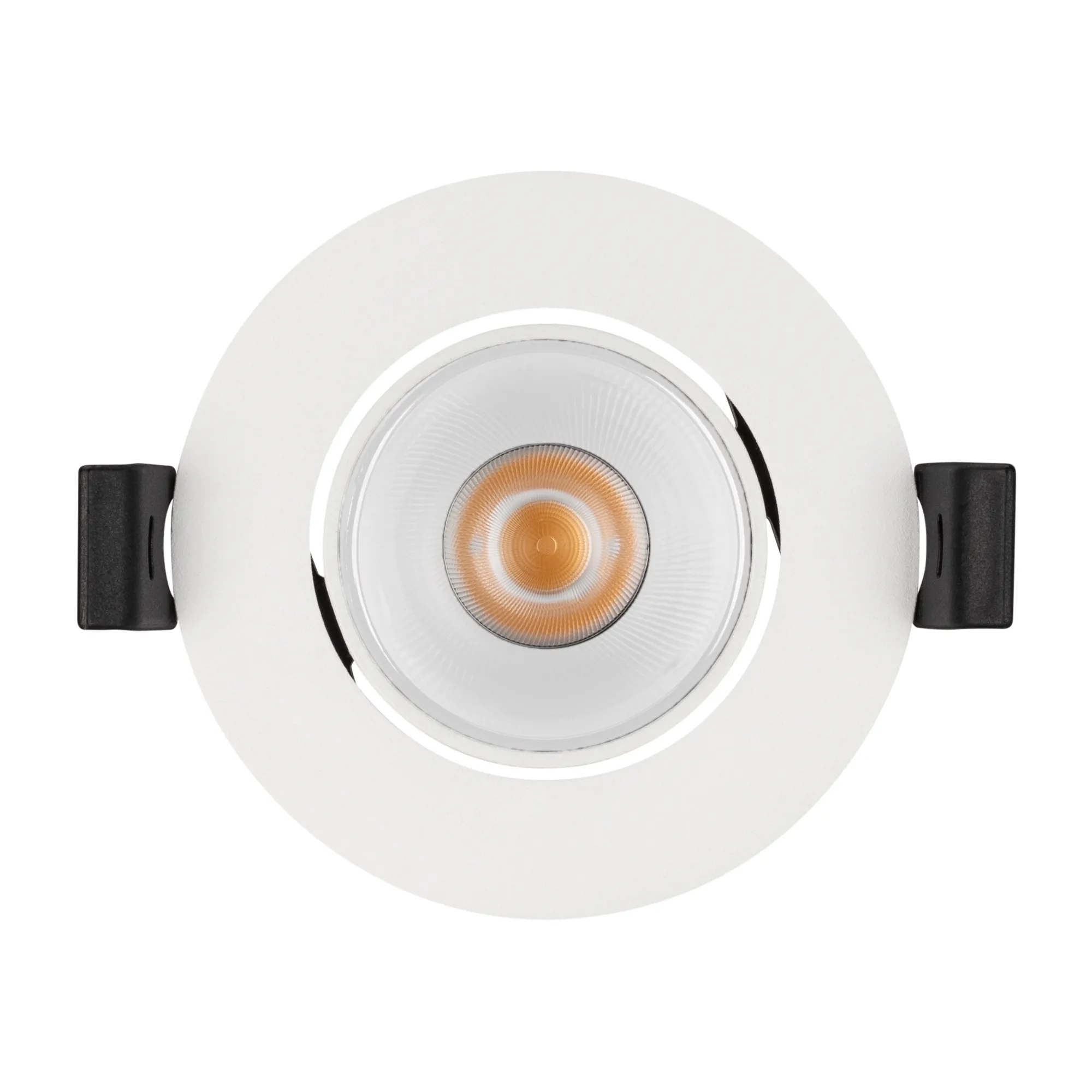 Встраиваемый поворотный светильник даунлайт. Мощность 8.4 Вт, св. поток 700 лм, 83 лм/Вт, теплый 3000 K, CRI>90, UGR<16, угол 32°, напряжение питания 230 В. Белый круглый корпус из алюминия, белый ГЛЯНЦЕВЫЙ отражатель из PMMA, степень защиты IP20. Размер: диаметр 82 мм, высота 51 мм. Монтаж встраиваемый, установочное отверстие: диаметр 75 мм. Драйвер 21-42 В, 200 мА, пульсация <2%.
