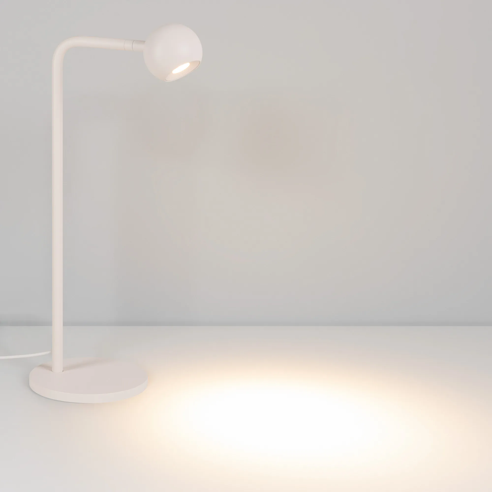 Декоративный настольный светильник. Мощность 6 Вт, св. поток 540 лм, 90 лм/Вт, теплый 3000К, CRI>90, угол 30°, напряжение питания 230 В. Белый корпус из алюминия (основание, ножка, светоизлучаль в форме шара), степень защиты IP20. Размер основания Ø140×11 мм, размер ножки Ø12,5×430х120 мм, размер светоизлучателя Ø65×55,5 мм. Длина провода 1580 мм, питание от сети 220-240V., пульсация <1%