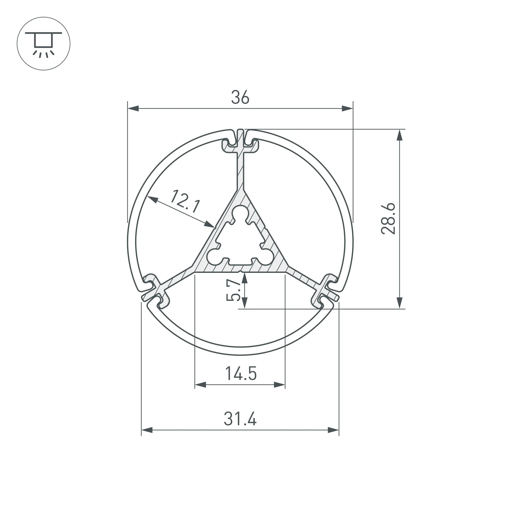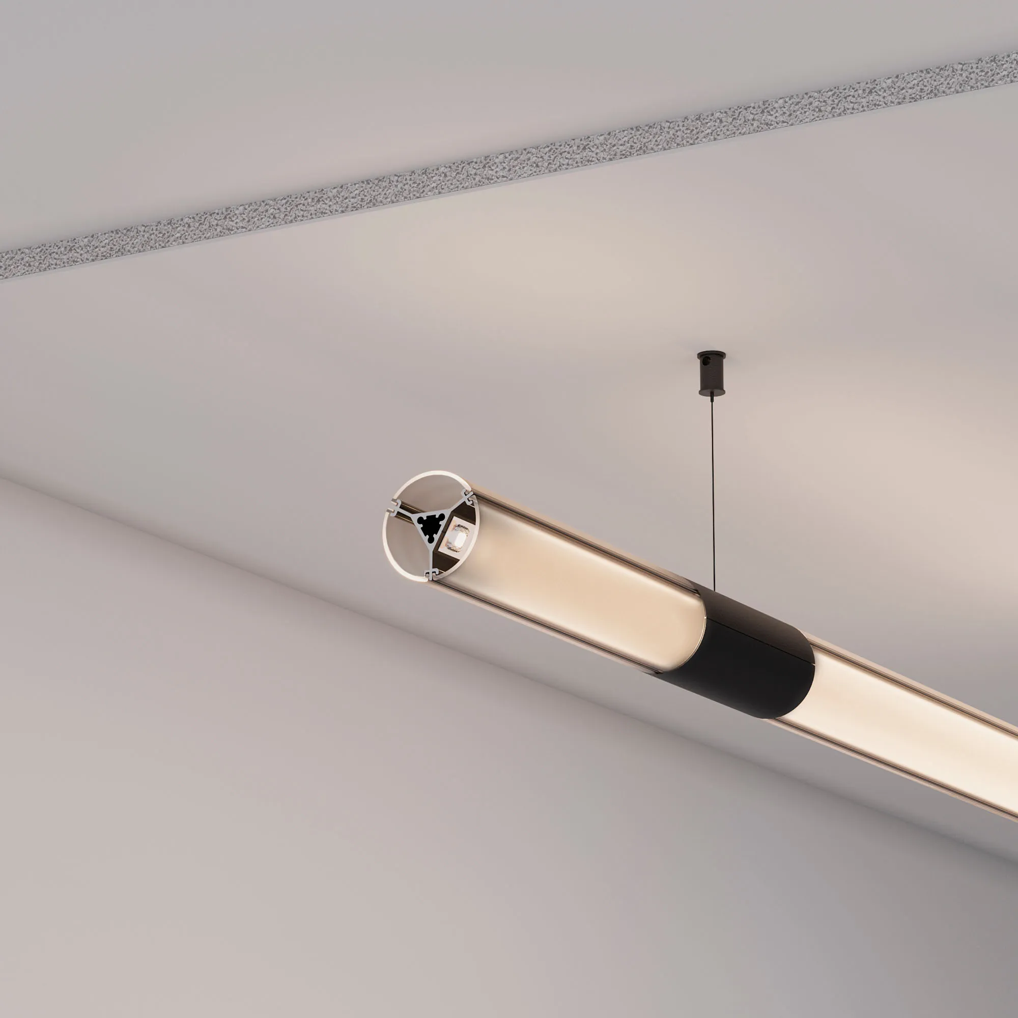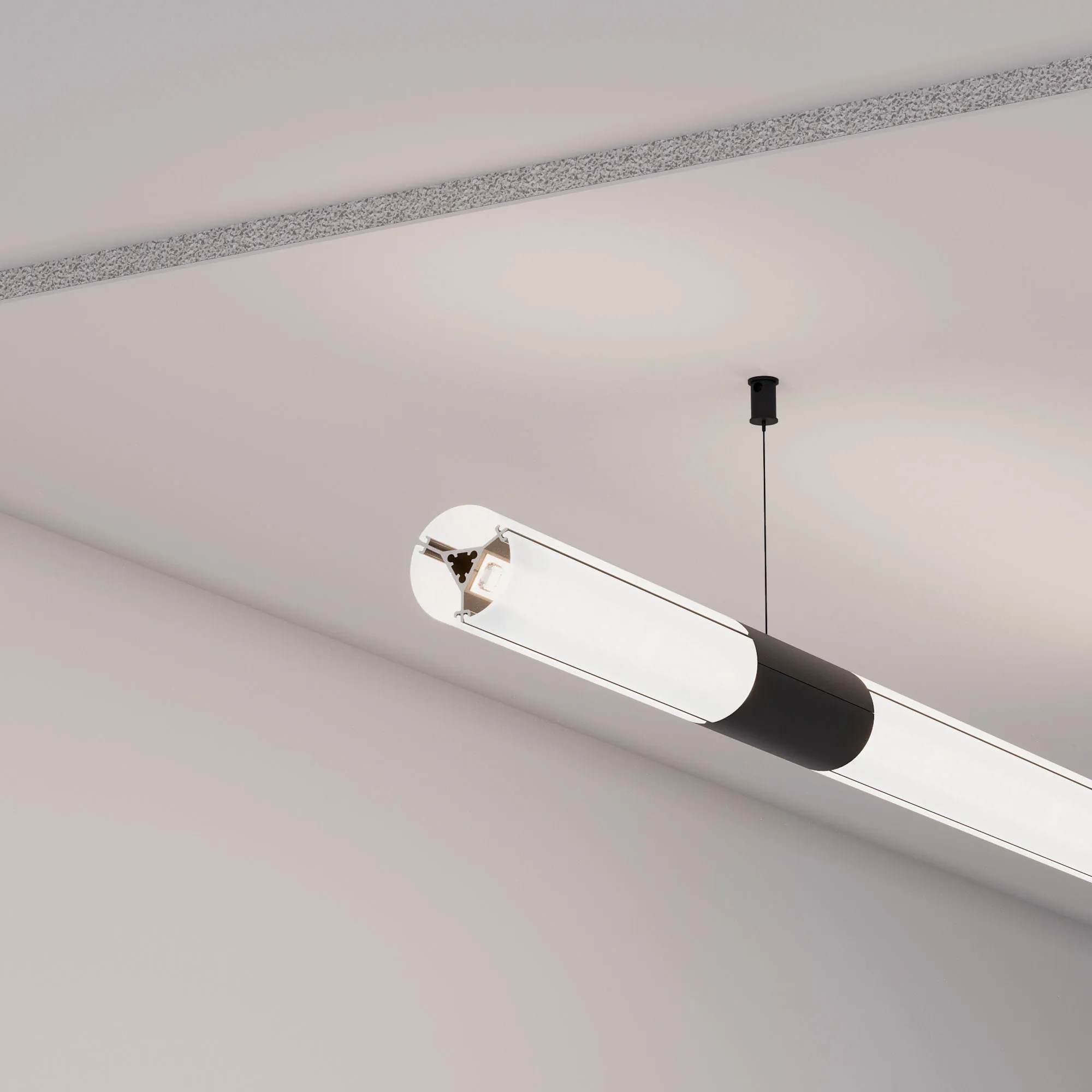 Подвесной алюминиевый анодированный профиль с тонкими черными гранями на круглом корпусе для создания объемных линий света со свечением 360 градусов. Габаритные размеры профиля (L×W×H): 2500x31,4x31,4 мм. Габаритные размеры профиля с экраном (L×D): 2500xD36 мм. Профиль имеет три площадки для светодиодной ленты. Ширина площадок для ленты 14,5 мм. Экран, заглушки и другие аксессуары приобретаются отдельно. Цена за 1 метр.