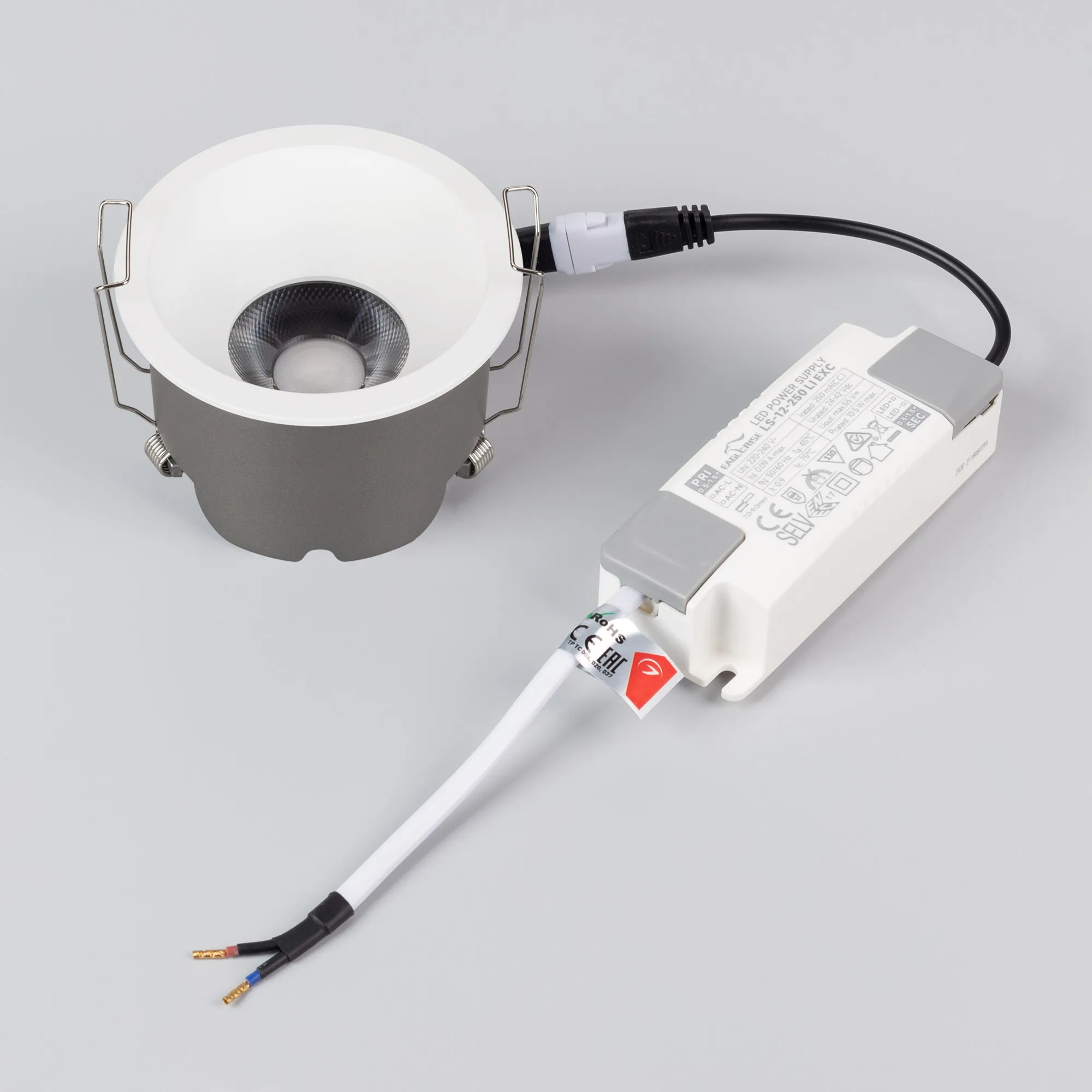 Встраиваемый светильник даунлайт. Мощность 10 Вт, св. поток 980 лм, 98 лм/Вт, тёплый 2700 K, CRI>90, угол 24°, напряжение питания 230 В. Белый круглый корпус из алюминия, степень защиты IP20. Размер: диаметр 82 мм, высота 53 мм. Монтаж встраиваемый, установочное отверстие: диаметр 75 мм. UGR<14. Драйвер 30-42 В, 250 мА, пульсация <2%.