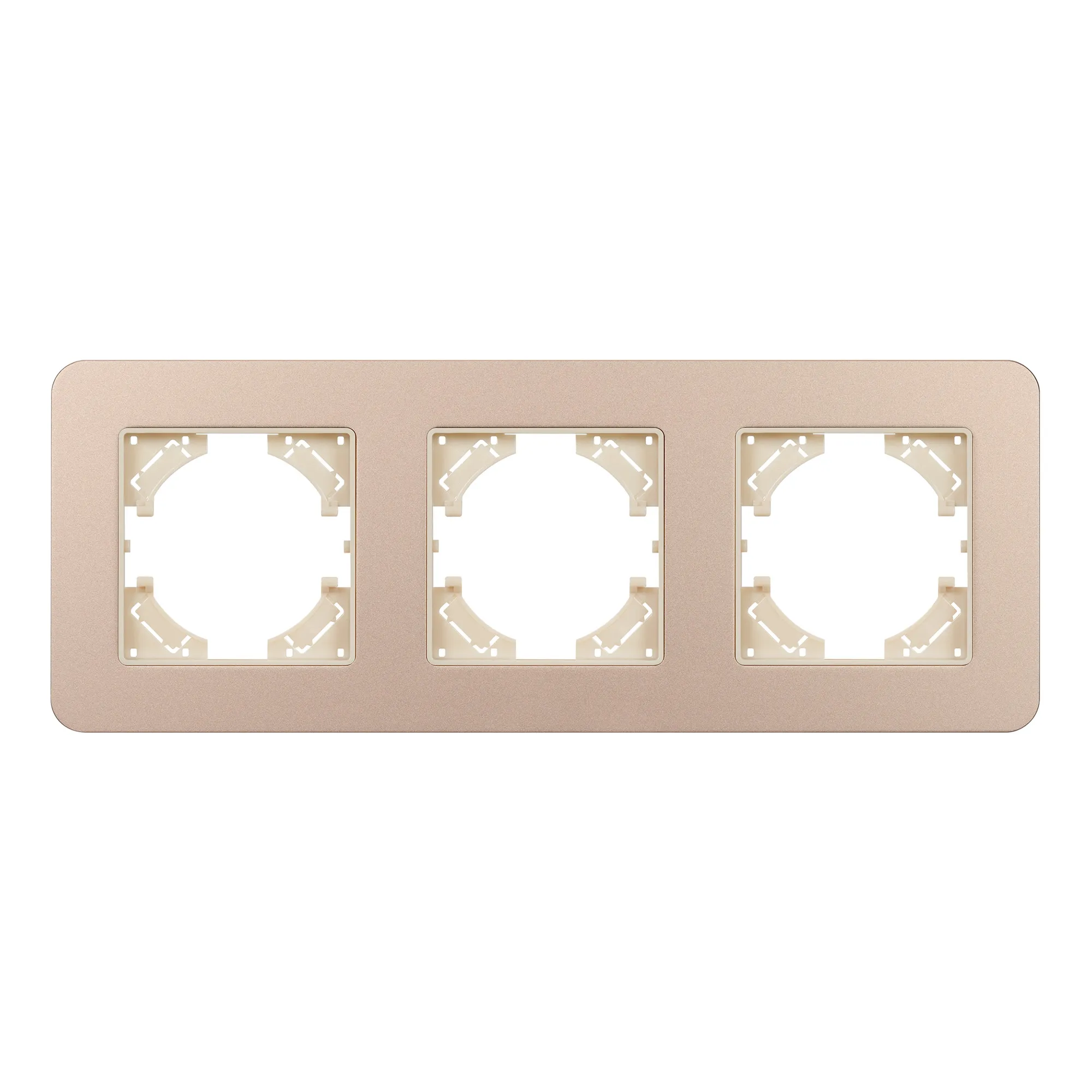 Рамка алюминиевая на 3 поста, под встраиваемый механизм. Цвет - золотой с Soft-Touch покрытием. Уровень герметичности IP20. Ориентация монтажа - горизонтальная (основным ориентиром служат посадочные выступы для накладки механизма).
