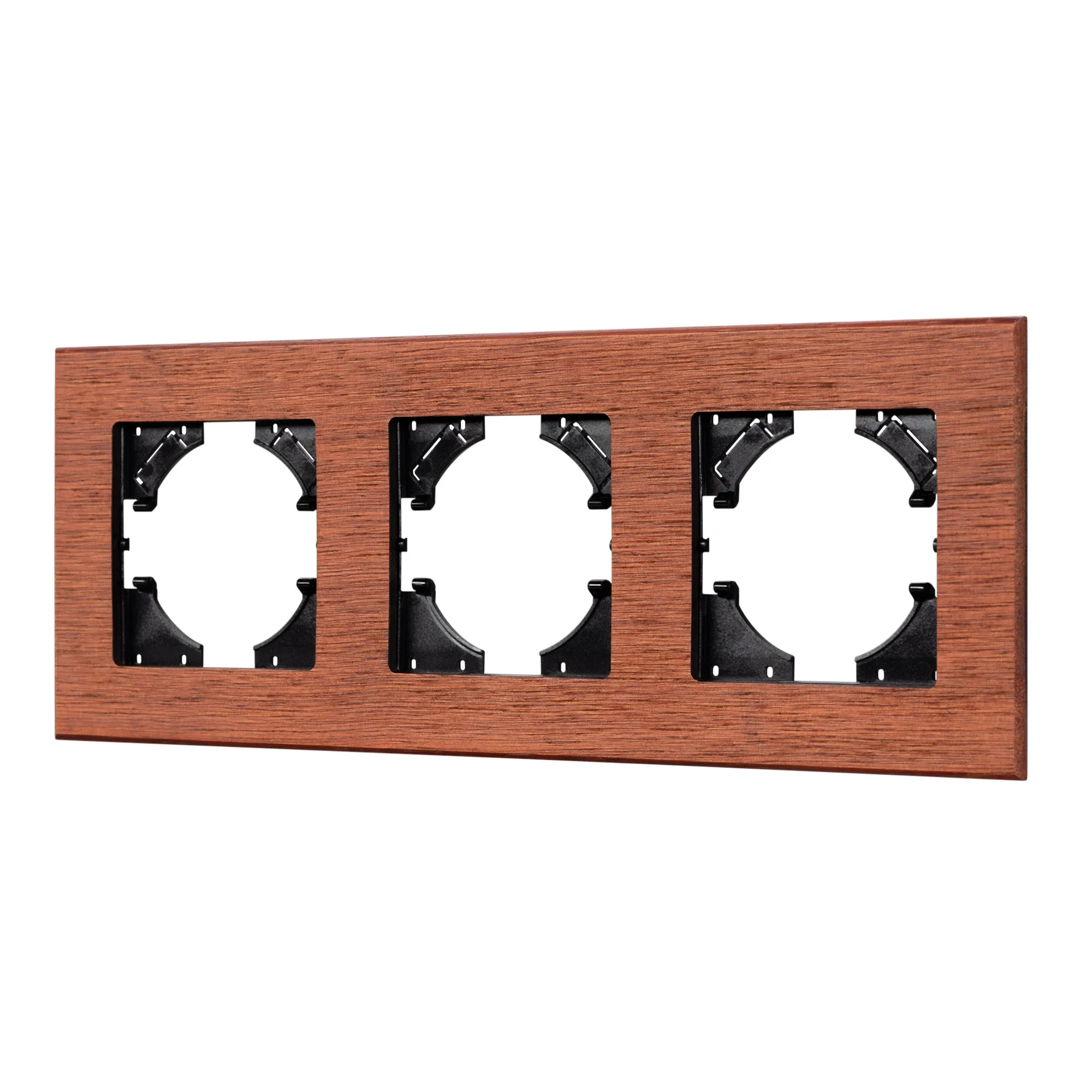 Рамка пластиковая на 3 поста, под встраиваемый механизм, с накладкой из натурального дерева. Цвет накладки - натуральное дерево*, цвет рамки - черный. Уровень герметичности IP20. Ориентация монтажа - горизонтальная (основным ориентиром служат посадочные выступы для накладки механизма).