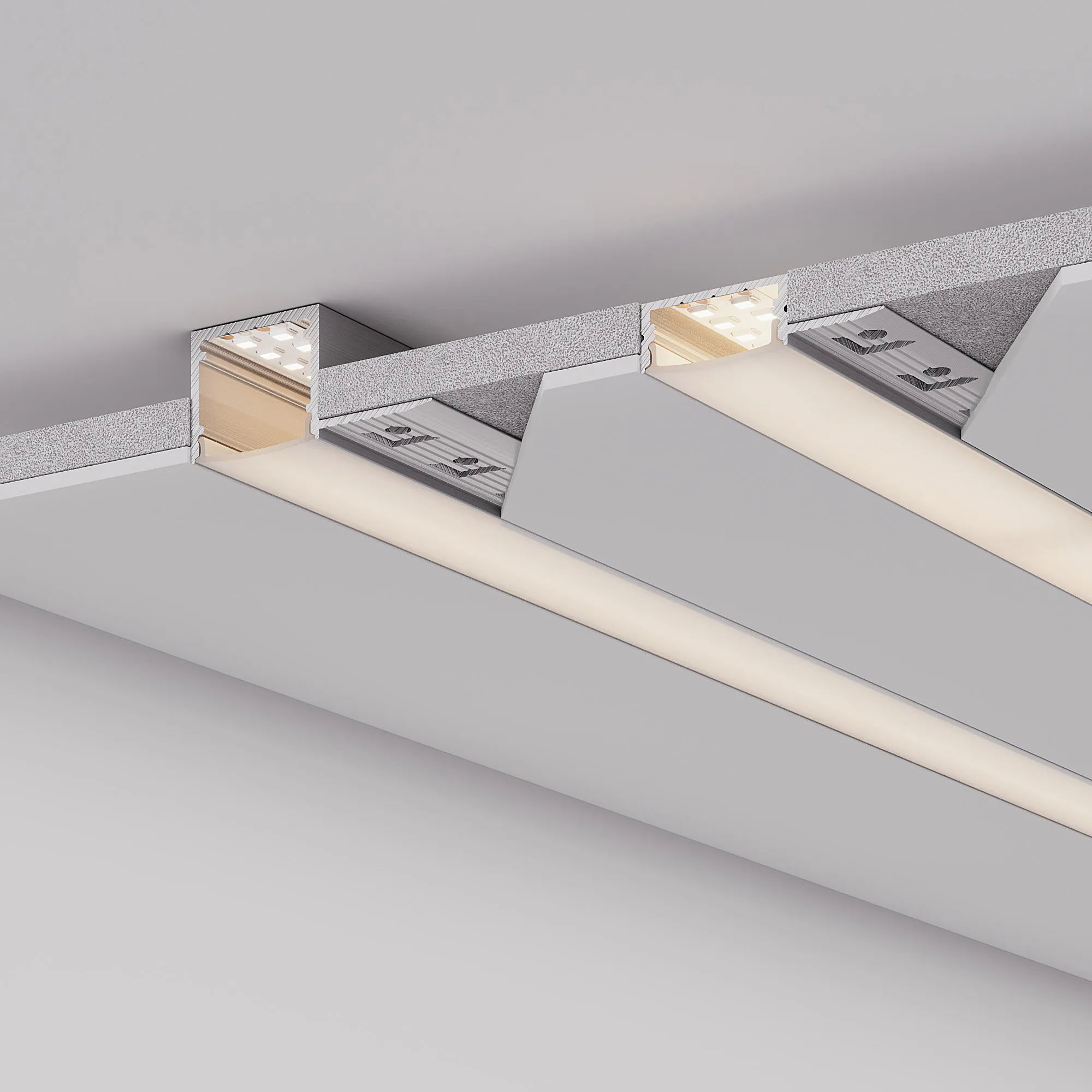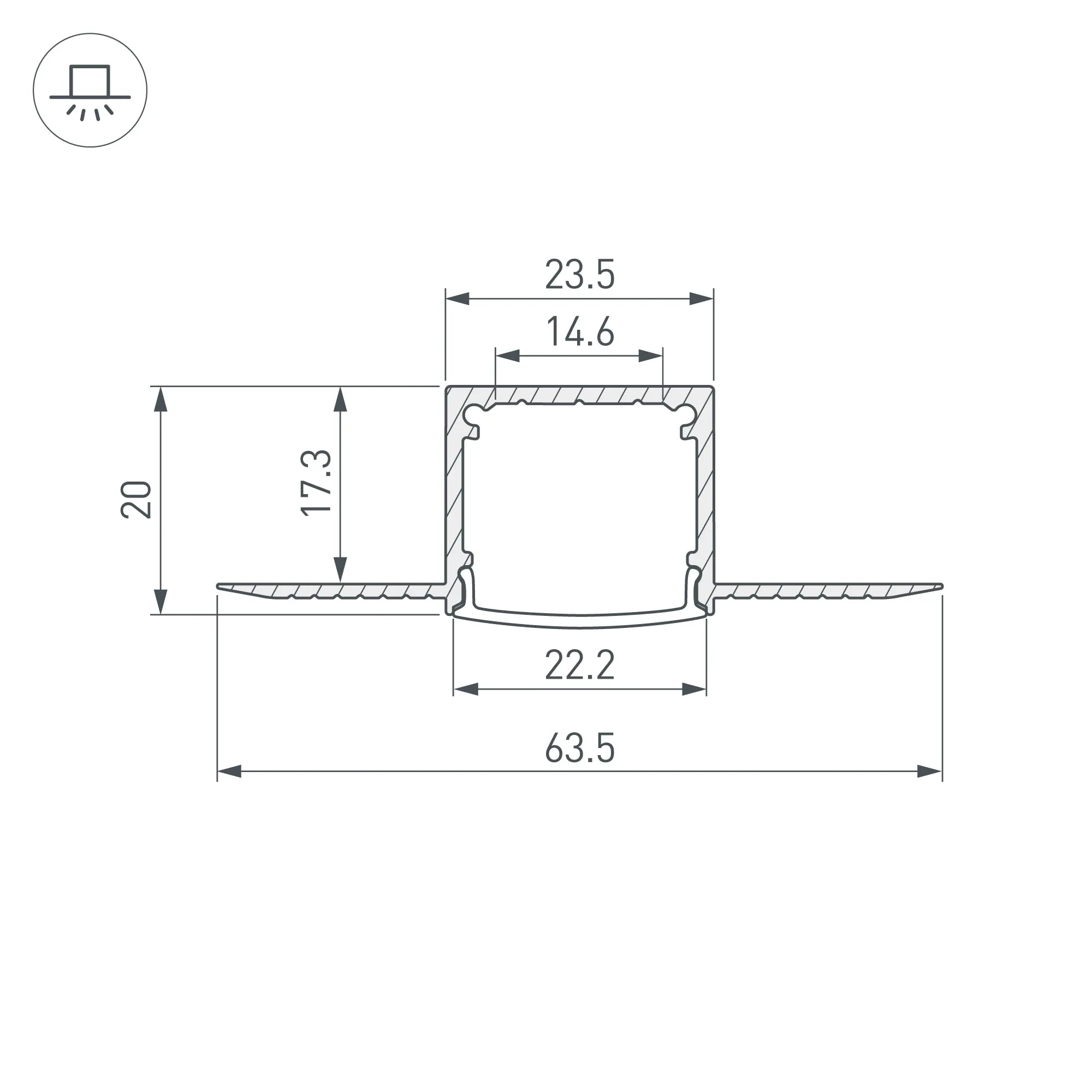 Алюминиевый профиль для светодиодных лент и линеек. Скрытая установка (под строительную отделку). Габаритные размеры (L×W×H): 2000x63,5x20 мм. Ширина площадки для ленты 14,6 мм. Экраны, заглушки и другие аксессуары приобретаются отдельно. Цена за 1 метр.