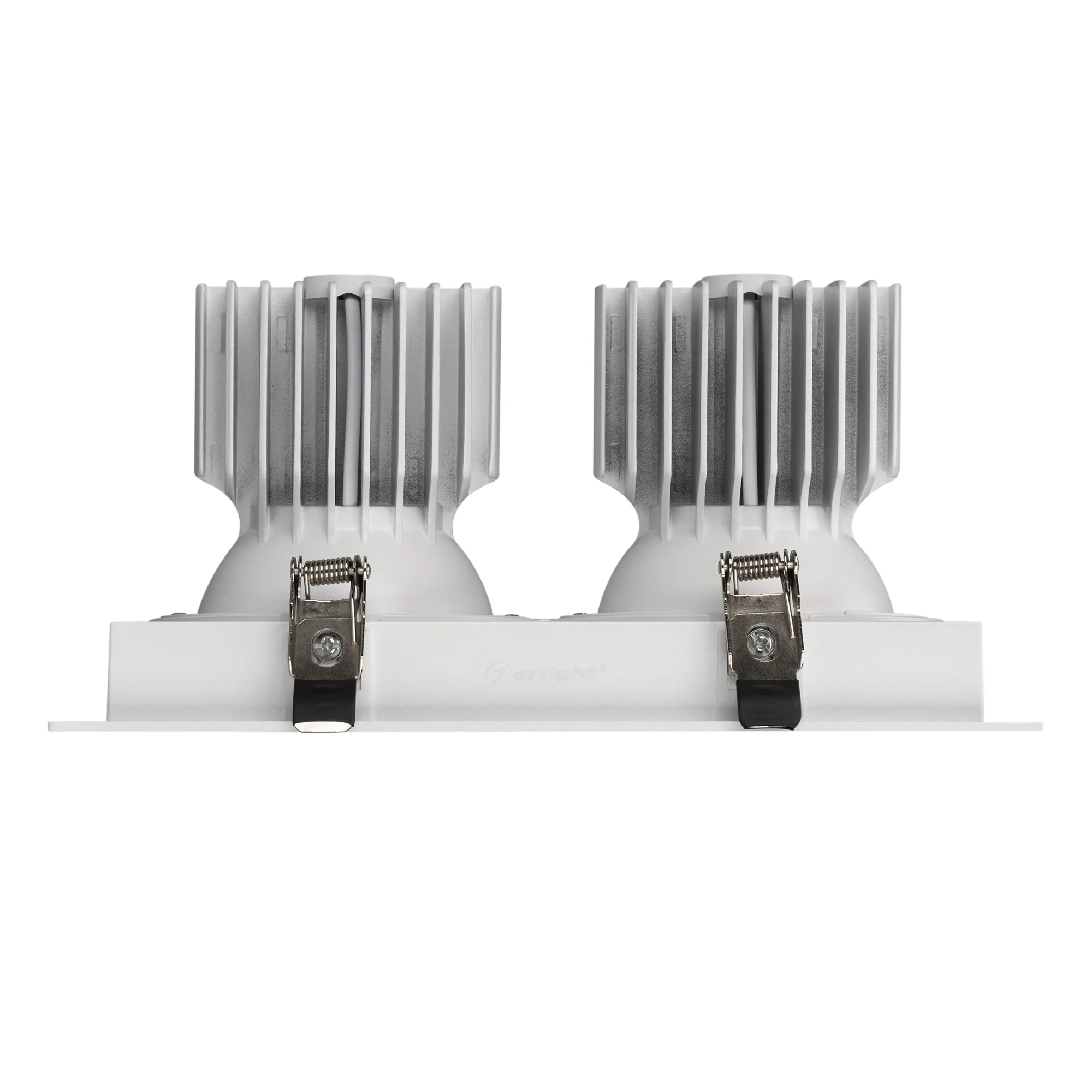 Встраиваемый карданный светильник. Мощность 2х30 Вт, св. поток 5300 лм, 88 лм/Вт, дневной 4000 K, CRI>92, угол 50°, напряжение питания 230 В. Белый корпус из алюминия, степень защиты IP20. Размер: длина 250 мм, ширина 140 мм, высота 125 мм. Монтаж встраиваемый, установочное отверстие: длина 230 мм, ширина 120 мм. Драйвер 24-42 В, 750 мА, пульсация <2%.