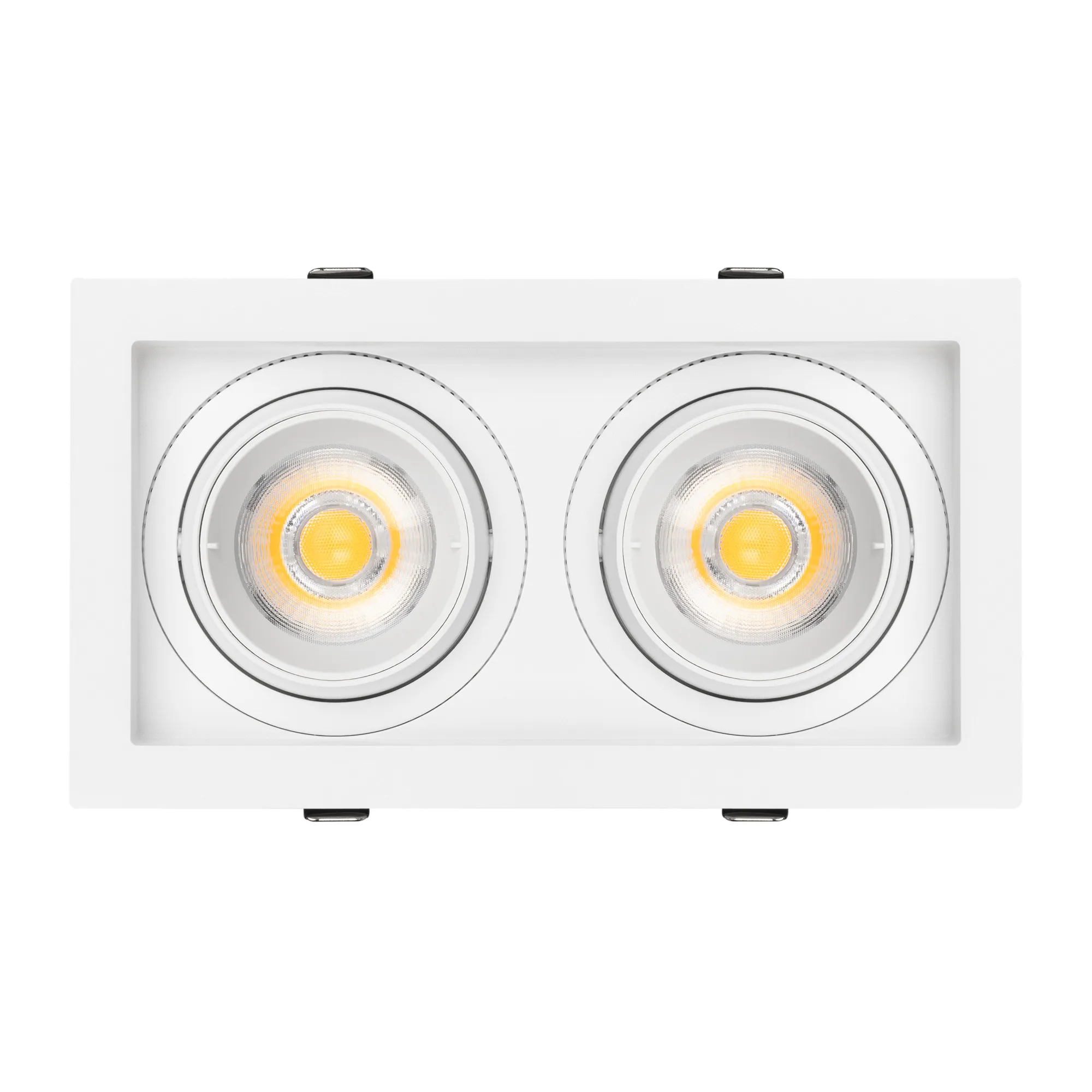 Встраиваемый карданный светильник. Мощность 2х20 Вт, св. поток 4264 лм, 106 лм/Вт, дневной 4000 K, CRI>92, угол 40°, напряжение питания 230 В. Белый корпус из алюминия, черная вставка, степень защиты IP20. Размер: длина 210 мм, ширина 117 мм, высота 105 мм. Монтаж встраиваемый, установочное отверстие: длина 190 мм, ширина 95 мм. Драйвер 24-42 В, 500 мА, пульсация <2%.