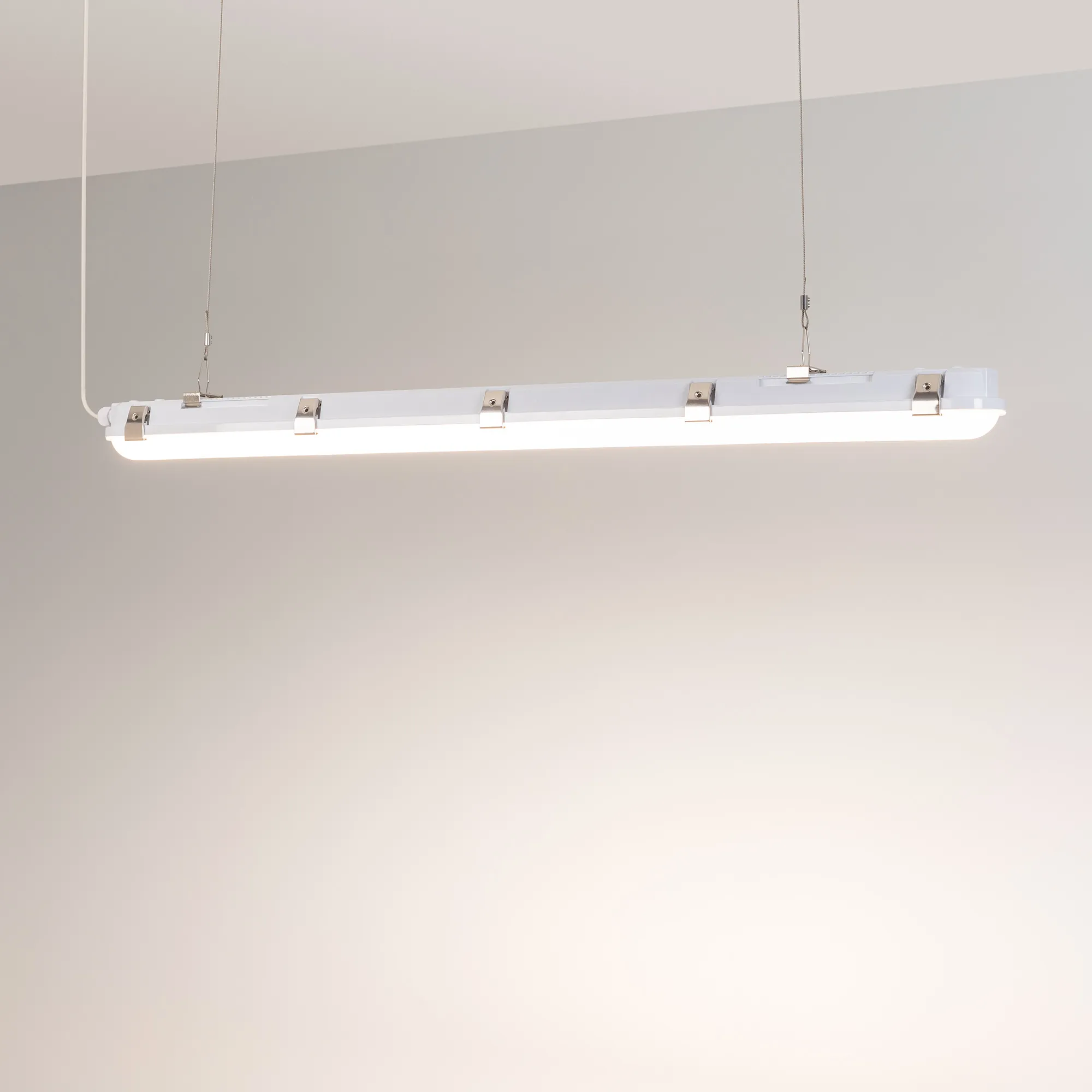 Влагозащищенный линейный светильник для использования в технических помещениях с блоком аварийного питания. Мощность светильника 40 Вт. (переключатель на корпусе драйвера). Цвет свечения ДНЕВНОЙ 4000К, св.поток 6240 лм, CRI(Ra)>80, угол свечения 120°. Корпус прямоугольный, белый пластик, влагозащищенный IP66. Время работы от БАП - 3 ч. Ударопрочность IK08. Размер LxWxH 1150x70x80мм. Питание AC 220-240В, 40 Вт, драйвер встроенный. Температура применения -20°C...+50°C. Материал корпуса и рассеивателя - поликарбонат.